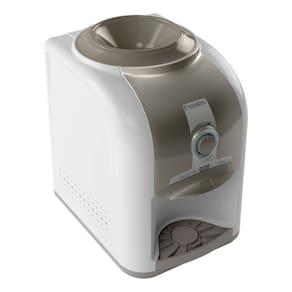 Bebedouro de água com sistema de refrigeração por compressor, oferecendo água em três temperaturas: fria, natural e gelada. Design compacto e elegante na cor branca.Função retrolavagem