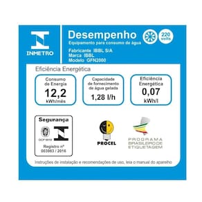 Informações Adicionais do produto: Ecocompressor: com gás R134a que não agride o meio ambiente Easy Clean: desmontável para higienização Serpentina externa: fácil higienização Grande vazão: copo cheio em poucos segundos Torneira Up Down Gabinete com proteção UV: evita que as partes brancas do purificador fiquem amareladas com o tempo** Para ambientes internos e áreas abertas externas (como áreas gourmet, lavanderias, etc) Acomoda Garrafão: 10 e 20 litros Volume Interno do Aparelho: 2 litros Capacidade de Fornecimento de Água: Gelada (L/h)*: 1,28 Temperatura de Resfriamento: 10° C / 50° F Vazão Mínima por Gravidade (L/h): 96 L/h Uso Residencial Uso Comercial Eficiência Energética: Grau de Proteção: IPX4 Amperagem (A: 1,5 / 0,7 Potência: 90W Frequência - Mercado Nacional: 60Hz Consumo de Energia: 12,2 (kWh/mês) Eficiência Energética (kW/L) 0,07