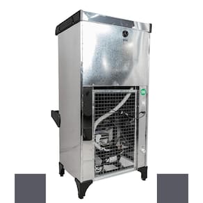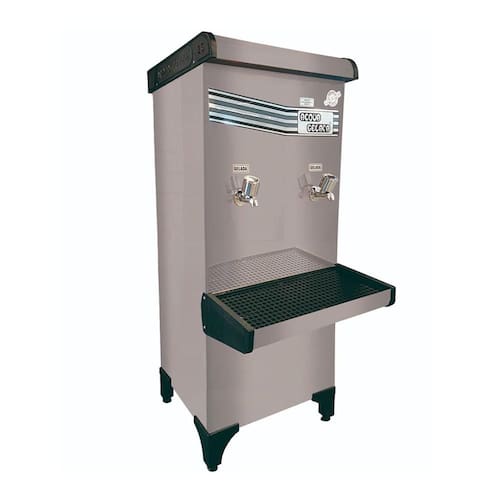 Bebedouro industrial de coluna com capacidade para 25 litros, 2 torneiras de água gelada, sistema de refrigeração de alta performance, estrutura em aço inox, termostato regulável e unidade condensadora EMBRACO de 1/6HP.Água gelada