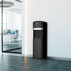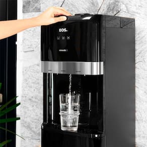 Bebedouro de coluna com compressor, água quente, gelada e natural. Possui cabine interna para alocar o garrafão de forma segura e discreta. Refrigeração por compressor com gás ecológico R134a. Design moderno e silencioso.Água gelada