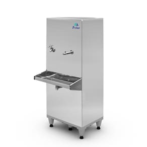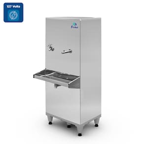 Bebedouro industrial Frisbel com capacidade de 50 litros, ideal para grandes ambientes. Possui duas torneiras (copo/garrafa e jato), filtro incluso e alta capacidade de refrigeração.Água gelada