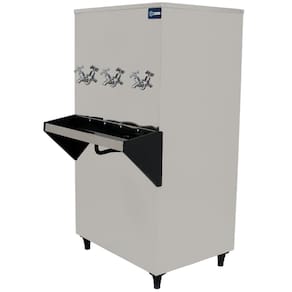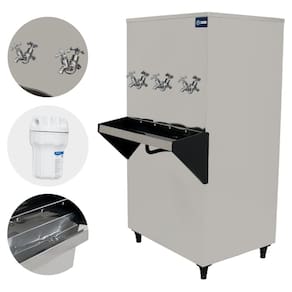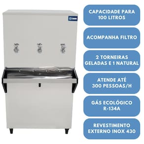 Bebedouro industrial de coluna com capacidade de 100 litros, 3 torneiras (2 gelada e 1 natural), revestimento em aço inox, termostato ajustável e baixo consumo de energia.Água gelada