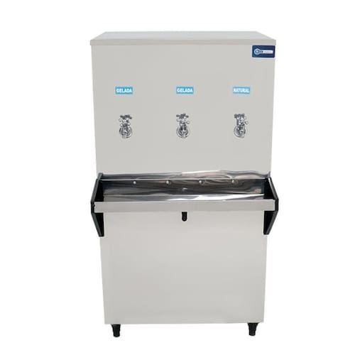 O modelo possui três torneiras, sendo duas para água gelada e uma para natural, além de filtro POU 5 classe C, que reduz impurezas e melhora o sabor da água. O aparador de água reforçado com laterais em ABS aumenta a segurança no uso e facilita a limpeza, enquanto os pés reguláveis garantem estabilidade em diferentes superfícies.