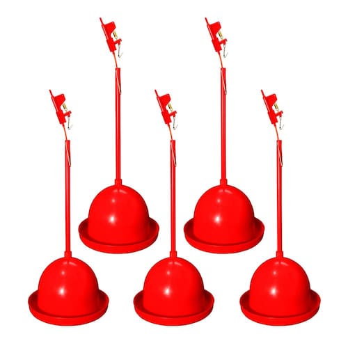 Kit Bebedouro pendular automático aves 5 unidades. Válvula pendular GRT para dosagem precisa da água. Gancho para facilitar a vacinação. Cúpula pendular injetada em polipropileno aditivado com 0,02% uv. Cor vermelha atrativa para as aves. Robusto e com peso ideal para garantir estabilidade. Calha inclinada para dentro proporcionando cama de frango mais seca. Capacidade para 80 a 100 aves cada. Tamanho do cabo: 0,50 cm. Kit com 5 unidades. Marca: Sgamaq.