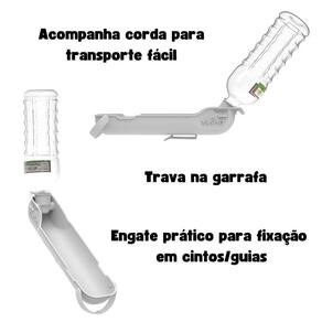 Engate prático para fixação em cintos/guias Trava na garrafa Acompanha corda para transporte fácil