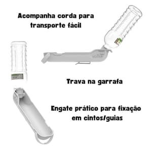 Engate prático para fixação em cintos/guias Trava na garrafa Acompanha corda para transporte fácil