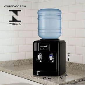 Bebedouro eletrônico para galões de 10 a 20 litros, com duas torneiras independentes para água natural e gelada. Possui sistema eletrônico de refrigeração, base pingadeira removível e indicador LED.Água gelada