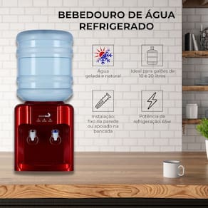 Refrigeração eletrônica, 2 torneiras (natural e gelada), bandeja coletora removível, indicador LED.Água gelada