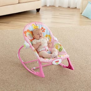 Esta é uma cadeirinha para meninas com uma linda estampa de coelhinho e três brinquedos interativos que se encaixam na barra. Ela é o produto perfeito para usar conforme o bebê cresce: uma cadeirinha de balanço com apoio dobrável que é facilmente convertida em um assento fixo para alimentação ou sono. Ela também pode ser usada como cadeira de balanço por bebês maiores - até alcançarem um peso de 18 kg! Há uma barra macia com 3 brinquedos giratórios divertidos: uma borboleta com um coração pendurado que toca música ao ser puxada e duas flores de cada lado. A barra é facilmente removida para ter acesso à menina, ou mesmo para quando ela estiver mais crescidinha. As vibrações calmantes e o acolchoado que pode ser lavado na máquina fazem deste o produto perfeito: tanto para a menina quanto para a mamãe.
