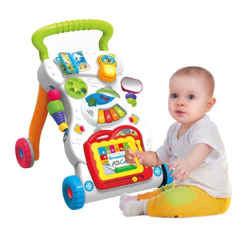 O andador possui diversos brinquedos que estimulam todos os sentidos inclusive lousa magnética para desenhar e pianinho musical.