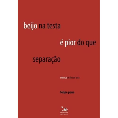 Este livro de crônicas de Felipe Pena traz à tona exatamente as características deste tipo textual, que são: breve narrativa a respeito de temas cotidianos e atuais, com linguagem simples e coloquial, exposição de sentimentos e reflexão a respeito do tema. Décimo quinto livro do autor, em Beijo na Testa é Pior que Separação - Crônicas do Fim de Tudo estão reunidas crônicas que tratam da ruptura de relacionamentos e que versam sobre os mais variados assuntos, dentre os quais estão a separação entre os casais, a política, o jornalismo e a literatura. A conexão entre as crônicas está no tema: a Separação. Alguns dos textos publicados nesse livro são inéditos; já outros foram veiculados em jornais, revistas e livros.