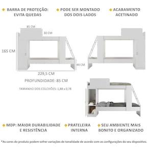 Produzido em MDP com acabamento acetinado (cerca de 20% de brilho), o Beliche 1 Porta Havana Multimóveis garante durabilidade e resistência. Suporta até 80kg em cada cama, possui barra de proteção na cama superior para evitar quedas, proporcionando noites de sono tranquilas e seguras, além de 1 porta lateral com prateleira interna, com amplo espaço interno para organizar roupas de cama ou pertences mais utilizados no dia a dia. A escada metálica em ângulo torna o acesso à cama superior muito mais fácil e prático. Além disso, o beliche pode ser montado dos dois lados - esquerdo ou direito. NÃO acompanha colchão (tamanho do colchão indicado: 188 x 78 cm). Esta é a escolha perfeita para deixar seu quarto mais convidativo para receber visitas ou acomodar seus filhos!