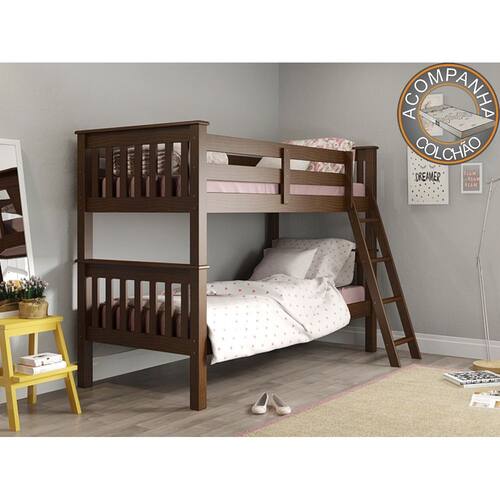 Características Estrutura em madeira ecologicamente correta (Eucalipto). Pintura com acabamento PU. Grade de segurança para a cama superior. Escada removivel. Pode ser desmontada e usada como duas camas de solteiro. Suporta até 95 Kg cada, sem impacto. Acompanha colchão de 188x88cm.