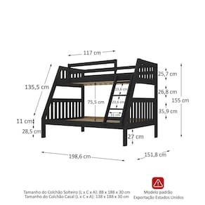 ATENÇÃO AS MEDIDAS DO COLCHÃO - BELICHE MODELO PADRÃO ESTADOS UNIDOS. Acompanha Cama Auxiliar: Não Acompanha Colchão: Não Altura do Estrado até o Chão: 28,5 cm Altura do Estrado Superior até o Chão: 1,178 cm Ambiente Principal: Quarto codigo_ean: 7900288082145 Complexidade da Montagem: Média: pode ser montado por mais de uma pessoa e/ou necessite de maior conhecimento para montagem Comprimento: 198,6 cm Cor: Preto Cor do Produto: Preto Escala de Brilho: Semi-Brilho Informações Complementares: Cama casal Suporta 240 kg - solteiro suporta 120 kg Itens Inclusos: 1 Beliche + 1 Manual de Montagem + 1 Ferragem Manual de Montagem e Instalação: https://cdn2.madeiramadeira.com.br/atributo/emporio-paraiso/2720197-5744-17407523008075.pdf Marca: Empório Paraíso Material da Escada: Madeira maçica Material do Estrado: madeira de pinus Material Principal: Madeira Maciça Necessita Montagem: Sim Número de Camas: 02 Origem do Produto: Nacional Permite a Utilização de Cama Auxiliar: Não Peso: 53,5 kg Peso Suportado por cada cama: 120 kg Possui Baú: Não Possui Escrivaninha: Não Possui Espelhos: Não Possui Grade: Não Possui Nichos: Não Possui Pés: Não Possui Portas: Não Possui Prateleiras: Não Recomendações de Uso, Manutenção e Limpeza: LIMPAR COM UM PANO SECO Sistema de Montagem: parafusos + cavilhas + suportes Suporta Até (kg): 240 kg Tamanho da Cama: Casal Tamanho do Colchão Indicado (L x C): 138x188 Tipo de Cama: Beliche Solteiro/Casal Tipo de Colchão: Casal Tipo de Estrado: Removível Tipo de Madeira Maciça: Pinus Trava de Segurança: Não Marca: Empório Paraíso
