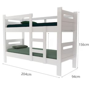Material da Estrutura: MDF de alta resistência e durabilidade.Capacidade de Carga: Suporta em média 110 kg cada camaEscada:Material: MDF resistente.Degraus antiderrapantes e amplos.Fixação segura e estável.Cercado de Segurança:Protege a cama superior contra quedas.Feito de MDF com acabamento liso e seguro.Acabamento: Pintura UV de alta resistência, fácil de limpar e resistente a riscos.Dimensões da Beliche:Comnto: 204 cm Largura: 94 cm Altura:156 cm Espaçamento entre as camas: 74 cm