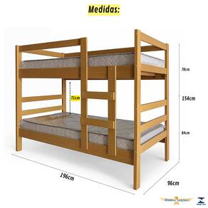 CARACTERÍSTICAS -Suporta 100 Kg em cada cama. -Altura total: 156cm. -Largura total: 94cm. -Pés com com protetor de umidade. -Estrado em madeira, com 5 ripas e 5 travessas cada um. -Acompanha manual com instruções simples e intuitivo.