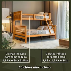 Beliche casal/solteiro em madeira maciça de pinus de reflorestamento e MDF de 2,2 cm de espessura, com pintura PU e acabamento UV 30% de brilho. Possui cama de casal na parte inferior e cama de solteiro na parte superior, com escada fixa frontal de 3 degraus e grades laterais para segurança na parte superior. Suporta até 240 kg na cama de casal e até 120 kg na cama de solteiro. A altura entre as camas é de 86 cm.