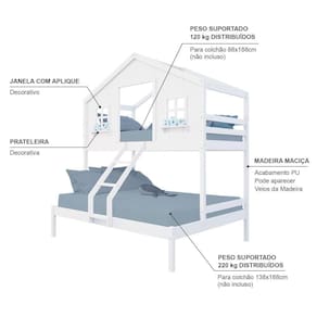 Material Principal: Madeira Maciça | Cor Predominante: Branco | Necessita Montagem: Sim | Acompanha Colchão: Não | Tipo de Cama: Beliche | Altura: 227 | Largura: 146,7 | Comprimento: 199 | Peso: 68 | Peso máximo suportado: 120 e 220 | Cor Via: Branco | Peso com Embalagem: 68 | Comprimento com Embalagem: 192 | Largura com Embalagem: 30 | Altura com Embalagem: 30 | Tamanho da Cama: Beliche Casal/ Solteiro | Descrição do Tamanho: Beliche Casal/ Solteiro | Quantidade de Caixas: 04