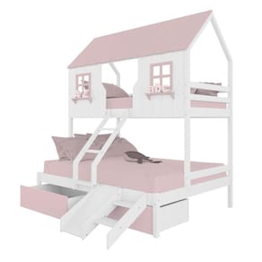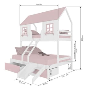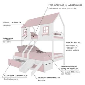 Diferenciais: Escada com Leve Curvatura, Casinha e Telhado com fechamento em MDF, Janela e Prateleira Decorativa, 02 Gavetas, Kit escada/ Escorregador.