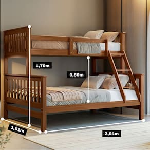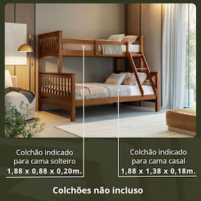 Modelo: B105 Material: Madeira Maciça de Pinus de Reflorestamento e MDF de 2,2cm de espessura Pintura/Acabamento: PU e UV 30% brilho Medidas dos Colchões da Cama de Solteiro (cm x cm): 188x88x20 (Não Incluso) Medidas dos Colchões da Cama de Casal (cm x cm): 188x138x18 (Não Incluso) Peso Suportado Cama de Solteiro: 120 Kg Peso Suportado Cama de Casal: 240 Kg Acessórios: Escada Fixa Altura entre camas: 86cm