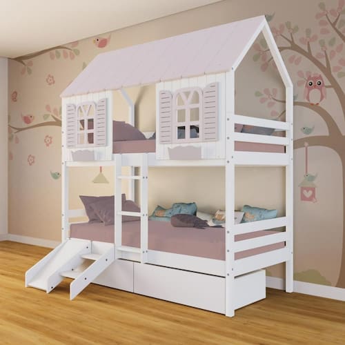 Diferenciais: Casinha e Telhado com fechamento em MDF, Janela e Cachepô, 02 Gavetas com Rodízios, kit Escada/Escorregador.