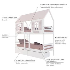 Material Principal: Madeira | Cor: Branco | Rosa | Necessita Montagem: Sim | Acompanha Colchão: Não | Tipo de Cama: Beliche Solteiro