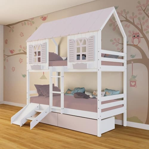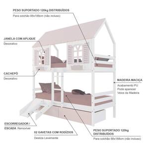 Diferenciais: Casinha e Telhado com fechamento em MDF, Janela e Cachepô, 02 Gavetas com Rodízios, kit Escada/Escorregador.