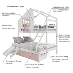 Diferenciais: Escada com Leve Curvatura, 02 Gavetas, Kit Escada/ Escorregador, Casinha com fechamento em MDF, Janela e Prateleira para Livros e Decoração,Montagem Reversível (Lado Direito ou Lado Esquerdo)