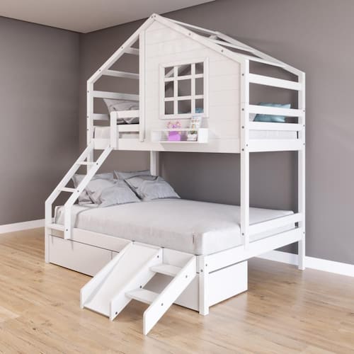 Diferenciais: Escada com Leve Curvatura, Casinha com fechamento em MDF, Janela e Prateleira para Livros e Decoração, 02 Gavetas, Kit Escada/ Escorregador