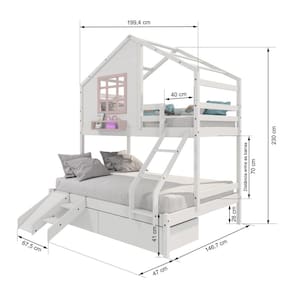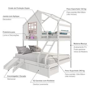 Diferenciais: Escada com Leve Curvatura, 02 Gavetas, Kit Escada/ Escorregador, Casinha com fechamento em MDF, Janela e Prateleira para Livros e Decoração,Montagem Reversível (Lado Direito ou Lado Esquerdo)