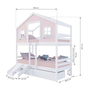 Material Principal: Madeira Maciça | Cor Predominante: Rosa/ Branco | Necessita Montagem: Sim | Acompanha Colchão: Não | Tipo de Cama: Beliche | Altura: 227 | Largura: 96,6 | Comprimento: 199 | Peso: 92 | Peso máximo suportado: 120 | Cor Via: Rosa/ Branco | Peso com Embalagem: 92 | Comprimento com Embalagem: 192 | Largura com Embalagem: 30 | Altura com Embalagem: 30 | Tamanho da Cama: Beliche Solteiro | Descrição do Tamanho: Beliche Solteiro | Quantidade de Caixas: 06