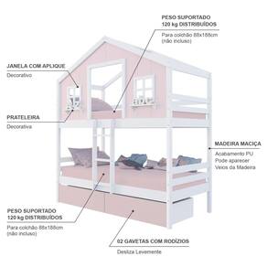 Diferenciais: Escada Fixa, Casinha com fechamento em MDF, Janela e Prateleira Decorativa, 02 Gavetas com Rodízios.