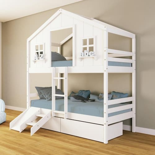 Diferenciais: Escada Fixa, Casinha com fechamento em MDF, Janela e Prateleira Decorativa, 02 Gavetas com Rodízios, Kit Escada e Escorregador.