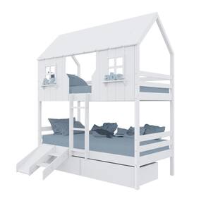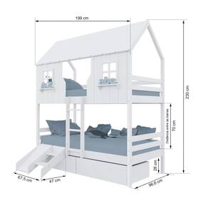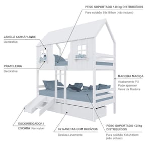 Diferenciais: Escada Fixa, Casinha e Telhado com fechamento em MDF, Janela e Prateleira Decorativa, 02 Gavetas com Rodízios, Kit Escada/ Escorregador.