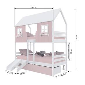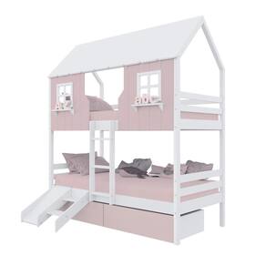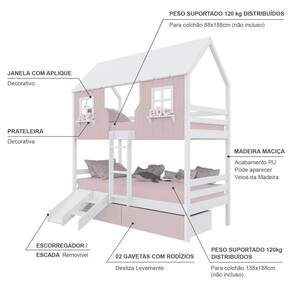 Diferenciais: Escada Fixa, Casinha e Telhado com fechamento em MDF, Janela e Prateleira Decorativa, 02 Gavetas com Rodízios, Kit Escada/ Escorregador.