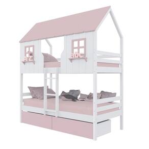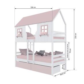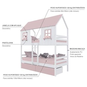 Diferenciais: Escada Fixa, Casinha e Telhado com fechamento em MDF, Janela e Prateleira Decorativa, 02 Gavetas com Rodízios.