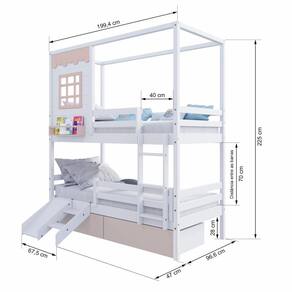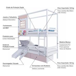 Diferenciais: Escada Fixa, 02 Gavetas, Kit Escada/ Escorregador, Grade de Proteção Removível, Casinha com fechamento em MDF, Janela e Prateleira para Livros e Decoração, Montagem Reversível (Lado Direito ou Lado Esquerdo)