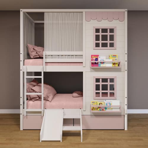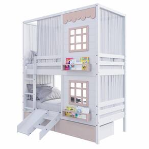 Beliche Casinha Reta 02 Janelas 02 Gavetas Rosa Cortina e Escorregador Madeira Maciça Branco/ Rosa Housin - Branco | Rosa | Rosa Claro