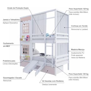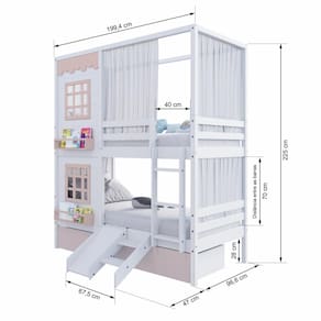 Diferenciais: Escada Fixa, 02 Gavetas, Kit Escada/ Escorregador, Kit Cortina Superior e Inferior, Casinha com fechamento em MDF, 02 Janelas e Prateleira para Livros e Decoração, Montagem Reversível (Lado Direito ou Lado Esquerdo)