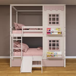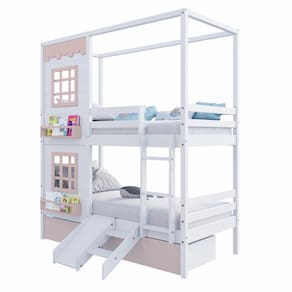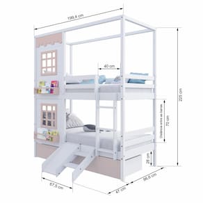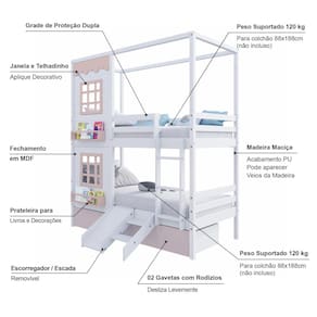 Diferenciais: Escada Fixa, Casinha com fechamento em MDF, 02 Janelas e Prateleira para Livros e Decoração, 02 Gavetas, Kit Escada/ Escorregador, Montagem Reversível (Lado Direito ou Lado Esquerdo)