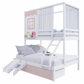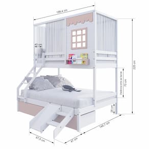 Diferenciais: Escada com Leve Curvatura, 02 Gavetas, Cortina, Kit Escada/ Escorregador, Casinha com fechamento em MDF, Janela e Prateleira para Livros e Decoração,Montagem Reversível (Lado Direito ou Lado Esquerdo)
