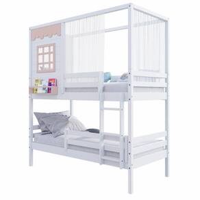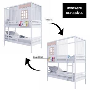 Diferenciais: Escada Fixa, Grade de Proteção Removível, Cortina Superior, Casinha com fechamento em MDF, Janela e Prateleira para Livros e Decoração, Montagem Reversível (Lado Direito ou Lado Esquerdo)