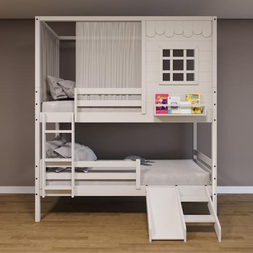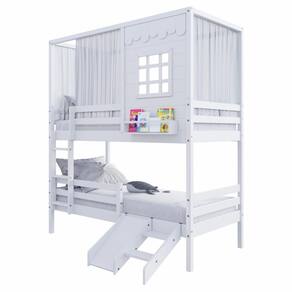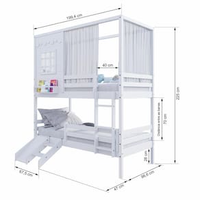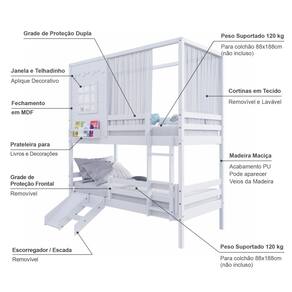 Diferenciais: Escada Fixa, Grade de Proteção Removível, Cortina Superior, Kit Escada/ Escorregdor, Casinha com fechamento em MDF, Janela e Prateleira para Livros e Decoração, Montagem Reversível (Lado Direito ou Lado Esquerdo)