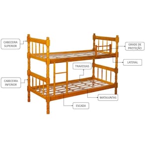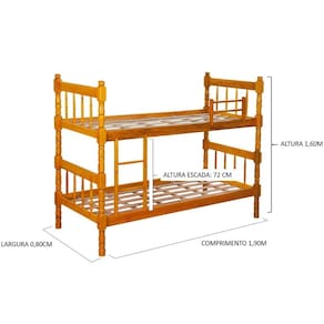 Características: Estrutura em madeira maciça Torneado Suporta até 120 kg Acabamento com pintura e verniz Indicação de colchão de 78x188cm Acabemento pintura e verniz. Grade Escada