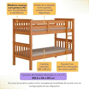Acabamento: Pintura PU | Material: Madeira Maciça | Referência do Modelo: CR35207 | Coleção: Beliche | Sistema de Montagem: O produto acompanha manual de montagem juntamente com kit ferragem. O produto será entregue desmontado e não disponibilizamos o serviço de montagem. | Instruções de Cuidado: Limpar com pano seco para retirar o pó. Não utilizar produtos químicos ou abrasivos a limpeza. Não aplicar lustra móveis. | Peso Suportado: 100kg | Largura Montado: 205.5 | Tamanho (L x A x P): 205,5 x 156 x 100 | Peso do Produto: 66 | Produto: Beliche | Beliche: Sim | RBN: 17100649011 | Altura Montado: 156 | Produto Composto Por: 1 beliche, manual de montagem e kit ferragem. | Acompanha Colchão: Não | Profundidade Montado: 100 | Tonalidade: Marrom | Com gaveteiro: Não | Requer Montagem: Sim | Garantia do Fabricante: 7 | Fabricante: Piratini | Tamanho da Cama: Solteiro | Altura (cm): 156 cm | Tipo de Cama: Beliche | Largura (cm): 100 cm | Comprimento (cm): 205,5 cm | Classificação da Cama: Solteiro | Estado de Origem: RS | Produto precisa de Montagem?: Sim, sugerimos a contratação do nosso serviço de montagem (para os CEPs em que o serviço está disponível) | Modelo de Cama: Beliche | Peso máximo suportado por cama: 100kg | Padrão da Cama: Padrão | Altura do Produto com Embalagem: 47 | Largura do Produto com Embalagem: 85 | Comprimento do Produto com Embalagem: 205 | Peso do Produto com Embalagem: 66 | Nome do Produto no Fornecedor: Beliche de Solteiro Madeira Maciça para Colchão 88 x 188 cm Multimóveis CR35207 Castanho | Descrição do Tamanho: (L x A x P): 205,5 x 156 x 100 cm | Tempo de Garantia: 7 meses | Destaque 1: Produzido em madeira maciça de pinus: alta qualidade e durabilidade. | Destaque 2: Tamanho do Produto Montado (L x A x P): 205,5 x 156 x 100 cm | Destaque 3: Tamanho de colchão indicado: 188 x 88 cm | Destaque 4: Peso Suportado: 100kg | Destaque 5: Acabamento em pintura PU: resistência e facilidade na limpeza. | Marca: Multimóveis | Peso (kg): 66 kg | FloorToTop (cm): 156 Centimetros | SideToSide (cm): 100 Centimetros | HeadToToe (cm): 205,5 Centimetros | Tipo de produto: bed Cor: Mel