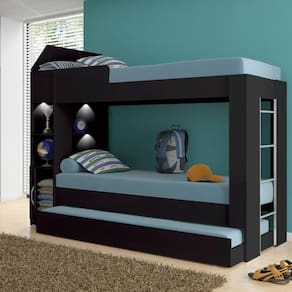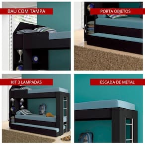 APÓS O PEDIDO FINALIZADO, NÃO ACEITAMOS TROCA DE COR DO PRODUTO E NEM ALTERAÇÃO DE ENDEREÇO DE .A Beliche Ditália com Cama Auxiliar e Kit Luz é a escolha perfeita para quem busca estilo, conforto e economia de espaço. Ele é versátil, permitindo acomodar a família, amigos ou convidados com facilidade.Além disso, possui uma estante integrada para exibir objetos de decoração e manter seus pertences organizados. A cama auxiliar deslizante maximiza o espaço disponível e pode ser guardada sob o beliche quando não estiver em uso.Outra grande vantagem é o amplo baú de armazenamento integrado, perfeito para guardar roupas de cama, travesseiros e cobertores, mantendo seu quarto arrumado e com espaço extra.Transforme seu quarto em um ambiente acolhedor e prático com o Beliche Ditália.CARACTERÍSTICAS- Revestimento Impressão Ultravioleta (UV) com acabamento alto brilho- Produzido em MDP 15mm- Possui três camas, todas para colchão de tamanho 1,88 x 78 x 12- Possui armário, bau e prateleiras- Cama auxiliar com rodízios- Não acompanha Colchões- Acompanha 1 Kit luz- Peso: 89,29 Kg- Altura: 154,00 cm- Largura: 85,00 cm- Profundidade: 224,60 cmINFORMAÇÕES DO KIT LUZ- Kit com 3 lâmpadas de LED de 5 watts cada e 1 controle remoto.- 2 níveis de ajuste de brilho, timer de 30 minutos e botão liga/desliga via controle remoto.- É possível também ligar e desligar tocando no interruptor diretamente na lente das luzes.- Fácil fixação com adesivo dupla face.- Alimentado por pilhas AAA (inclusas).- Dimensão das lâmpadas: 9x7x2,1 cm.- Dimensão do controle remoto: 8x5,9x1,5 cmAcompanha kit ferragens e manual de montagem (montagem não inclusa).Este produto é vendido desmontado em 4 volumes, embalado em caixa de papelão com isopor nas laterais e revestidos com plásticos termoencolhível.A fixação é feita por girofix, cavilhas e parafusos, não é necessário parafusar na parede.PERGUNTAS FREQUENTES1 - O produto é entregue montado?Resposta: Nossos produtos são entregues desmontados. Os móveis são acompanhados de todos componentes necessários (manual de montagem, parafusos, pregos, puxadores e etc..) para que possam ser montados com facilidade.2 - Vocês oferecem serviço de montagem?Resposta: Não disponibilizamos este serviço.3 - Qual o valor da ?Resposta: O valor referente a dependerá do destino final da mercadoria, para calcular o valor, é considerado o CEP do consumidor.4 - Os produtos são s?Resposta: Sim, trabalhamos apenas com produtos s.5 - Vocês atendem todos os estados do Brasil?Resposta: Sim, enviamos nossos produtos para todo o Brasil.6 - Os colchões acompanham o produto?Resposta: Não, os colchões não acompanham o produto.7- Acompanha kit luz?Resposta:Sim, acompanha 1 kit luz.LIMPEZALimpar utilizando apenas pano umedecido com água, nunca utilizar abrasivos ou esponjas de aço.GARANTIAGarantia de 3 meses (contra defeitos de fabricação).OBSERVAÇÕES- Montar o móvel com o produto virado de costas, para montagem, forrar o chão com o papelão das embalagens.- Não expor o móvel a fontes de calor ou de umidade.- As imagens indicam uma sugestão de uso e são apenas ilustrativos, os objetos decorativos não estão inclusos.- As cores dos produtos podem variar devido à reprodução sobre a tela do dispositivo.