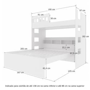 A Beliche Family Queen Foscarini é uma ótima opção para otimizar o espaço em quartos menores, proporcionando mais praticidade ao ambiente. É produzida 100% em MDF, material de alto nível, seus diferenciais são notáveis na qualidade dos acabamentos e pintura em estufas modernas UV. Pensando no conforto e segurança, a cama superior possui grade de proteção lateral e um fácil acesso através da escada. Seu sistema de montagem é rápido, fácil e descomplicado, realizado através de parafusos, minifix e cavilhas. É ideal para colchões de 88 x 188 cm e 158 x 198 cm. Sua estrutura principal é de 25mm com detalhes em 15mm. Medidas montado (A x L x P): 182 x 195 x 210 cm. Produto resistente moderno e sofisticado! Se encaixa perfeitamente em vários estilos de decoração. Prática e funcional. Acompanha Cama Auxiliar: Não Acompanha Colchão: Não Altura do Estrado até o Chão: 40 Ambiente Principal: Quarto Infantil codigo_ean: 7908243318599 Complexidade da Montagem: Média: pode ser montado por mais de uma pessoa e/ou necessite de maior conhecimento para montagem Cor: Branco Cor do Produto: Branco Escala de Brilho: Fosco Itens Inclusos: 1 Beliche, Kit Ferragens e Manual de Montagem. Linha ou Coleção: Bari Manual de Montagem e Instalação: https://product-hub-prd.madeiramadeira.com.br/878315/documents/b6c7188c-be11-47dd-b18e-09976bba129b1652496u233537belichequeen.pdf Material do Estrado: MDF Material Principal: MDF Necessita Montagem: Sim Origem do Produto: Nacional Permite a Utilização de Cama Auxiliar: Não Peso: 191 Possui Baú: Não Possui Gavetas: Não Possui Pés: Não Possui Portas: Não Possui Prateleiras: Não Recomendações de Uso, Manutenção e Limpeza: Limpar com flanela ou pano macio seco, não utilizar produtos abrasivos, desengordurantes, álcool ou solvente. Não expor o produto diretamente à luz solar e à umidade. Sistema de Montagem: Parafusos, minifix e cavilhas. Suporta Até (kg): 340 Tamanho do Colchão Indicado (L x C): 88 X 188 e 158 x 198 Tipo de Colchão: Solteiro Tipo de Estrado: Fixo Ean: 7908243318599