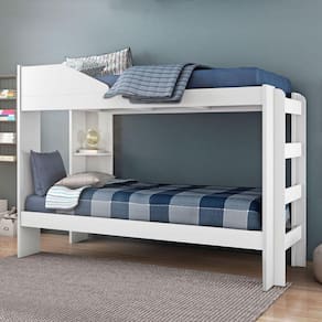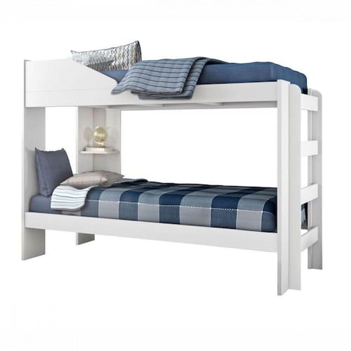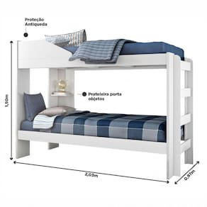 Estrutura MDP/MDF 12, 15, 18 e 25mm Acabamento/Pitura UV fosco Não se transforma em duas camas Medida entre as camas 0,78m Para colchão de 0,88 - Não Acompanha Colchão- Prateleira porta objetos / Proteção antiqueda CAMA AUXILIAR NÃO ACOMPANHA O PRODUTO Suporta 80kg por cama Distribuído Garantia 03 meses