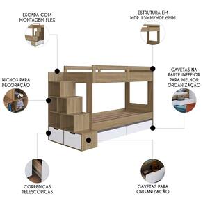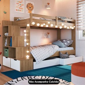 Características do Produto Material da estrutura: MDP 15 mm/MDF 6 mm. Peso Suportado: 80 Kg distribuídos. Revestimento: Pintura BP. Possui Pés: Sim. Material dos Pés: Sapatas plásticas. Quantidade de Pés: 11 Sapatas. Possui Rodízios: Sim. Possui Gavetas: Sim. Quantidade de Gavetas: 4 Gavetas. Material das corrediças: Corrediças telescópicas. Peso suportado gavetas:5 Kg Gavetas laterais/ 25 Kg Gavetões. Possui Nichos: Sim. Quantidade de Nichos: 5 Nichos. Peso suportado Nichos: 5 Kg distribuídos. Acompanha Colchão: Não. Acompanha Cabeceira: Não. Diferenciais: - Design moderno. - Escadas flexível pode ser montada tanto do lado direito quanto do esquerdo. - Nicho nas escadas. - Gavetões com rodizios. - Corrediças telescópicas. Sistema de Montagem: Parafusos/Cavilhas/Minifix/PorcasElípticas. Manual de Montagem: Não. Complexidade da Montagem: Baixa. Conteúdo da Embalagem: 1 Beliche, 2 Gavetões. Volumes: 4 Volumes. Garantia do Fabricante: 90 dias contra defeitos de fabricação. Montagem: Recomendamos que seja feita por um profissional. Recomendação de limpeza: Utilize pano levemente úmido.
