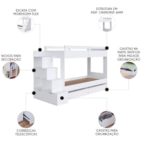 A Beliche Infantil Com Escada e 4 Gavetas Infix C06 Branco, da Mpozenato, é uma solução inovadora e inteligente para transformar o Quarto Infantil em um espaço encantador e funcional.